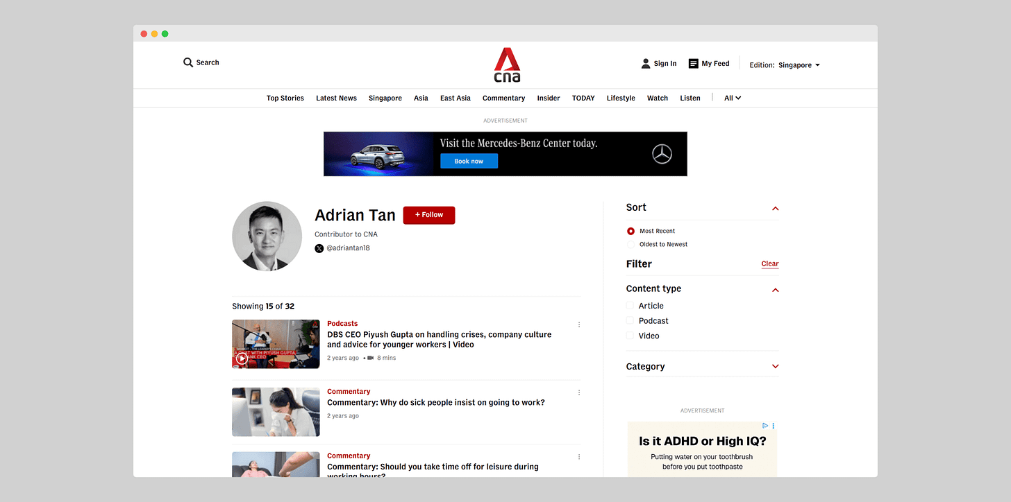 My regular commentaries for Channel NewsAsia threw open doors, with invitations for podcasts, panel spots, and new client relationships that followed.