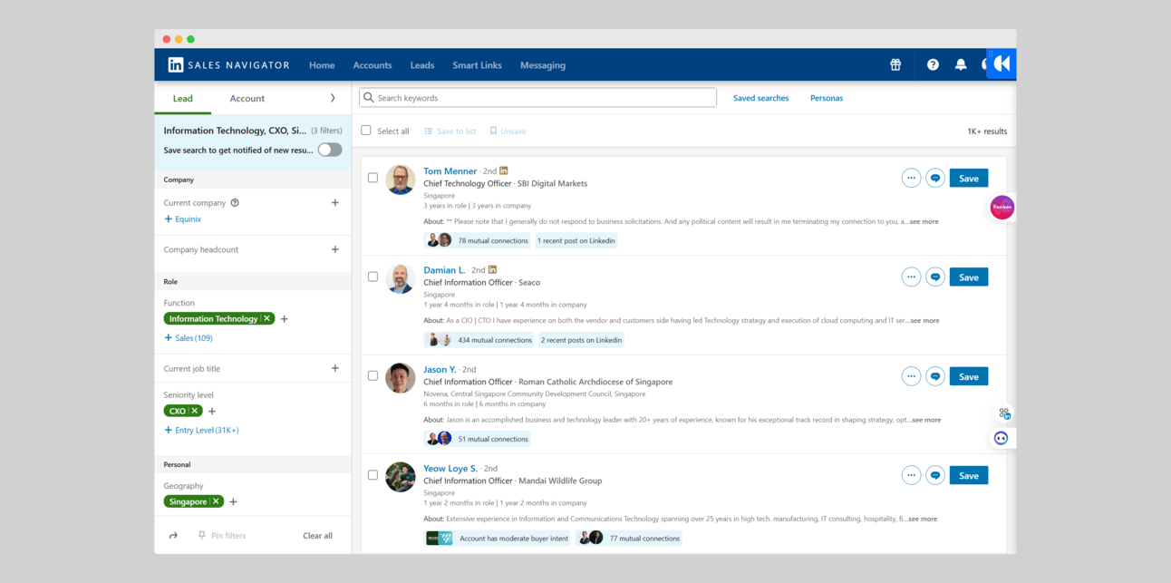 LinkedIn Sales Navigator showing 1k+ CTO just in Singapore
