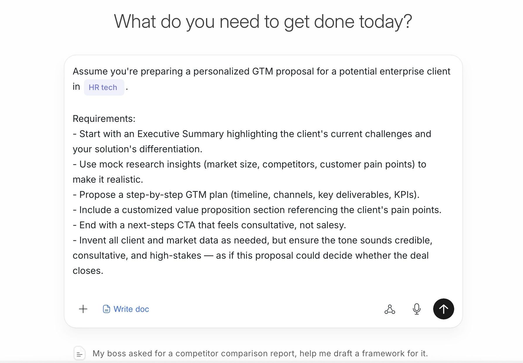 I’m assuming I’m pitching a new client. First, I’ll create a GTM proposal, then dive into their sales data, and finally turn everything into a deck.