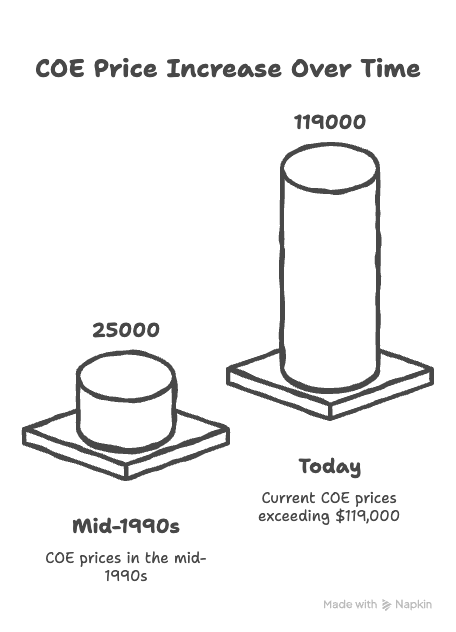 COE prices jumped from $25,000 in the 1990s to $119,000 today—a 375% increase while salaries barely doubled. The people setting transport policy? They already own cars.