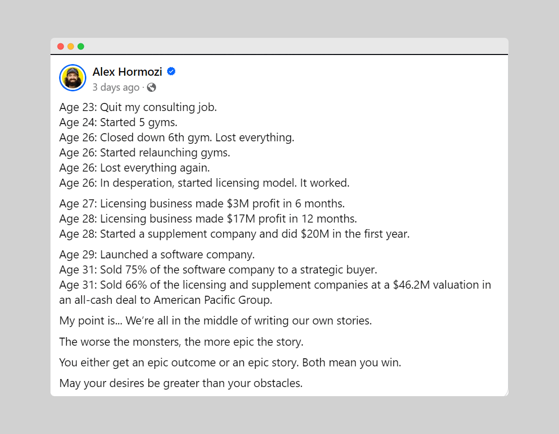 The same goes for Alex Hormozi who lost everything twice before finding what works for him.